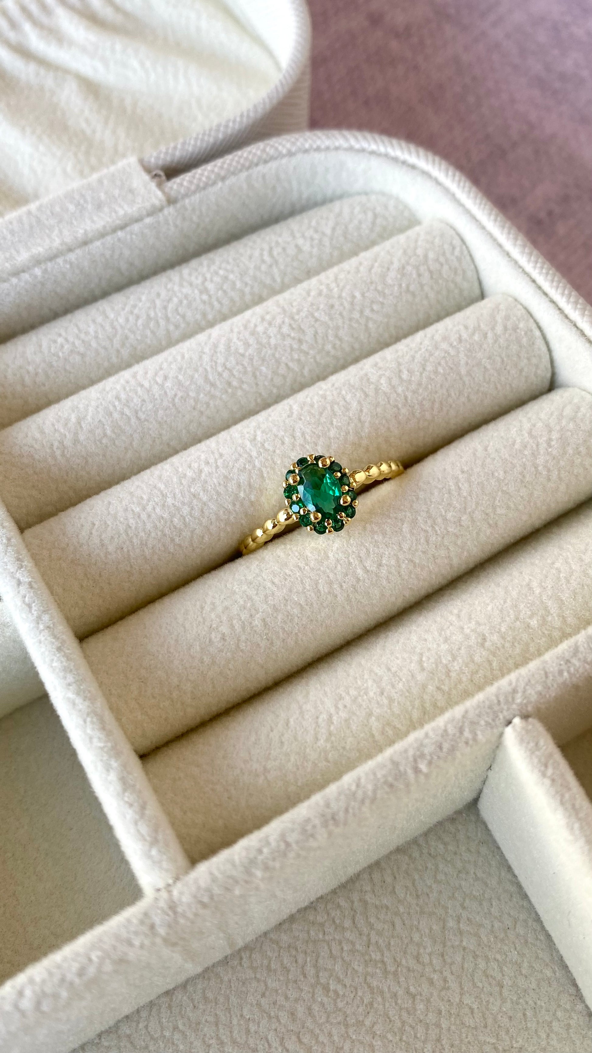 Anillo con hermosa piedra verde bañado en oro.