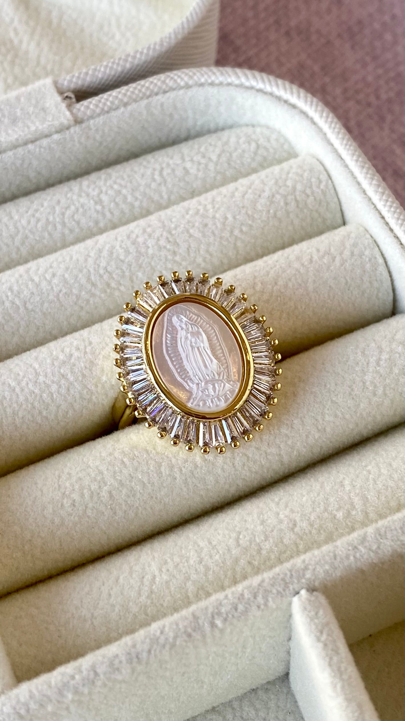 Hermoso anillo de la virgen de Guadalupe bañado en oro.
