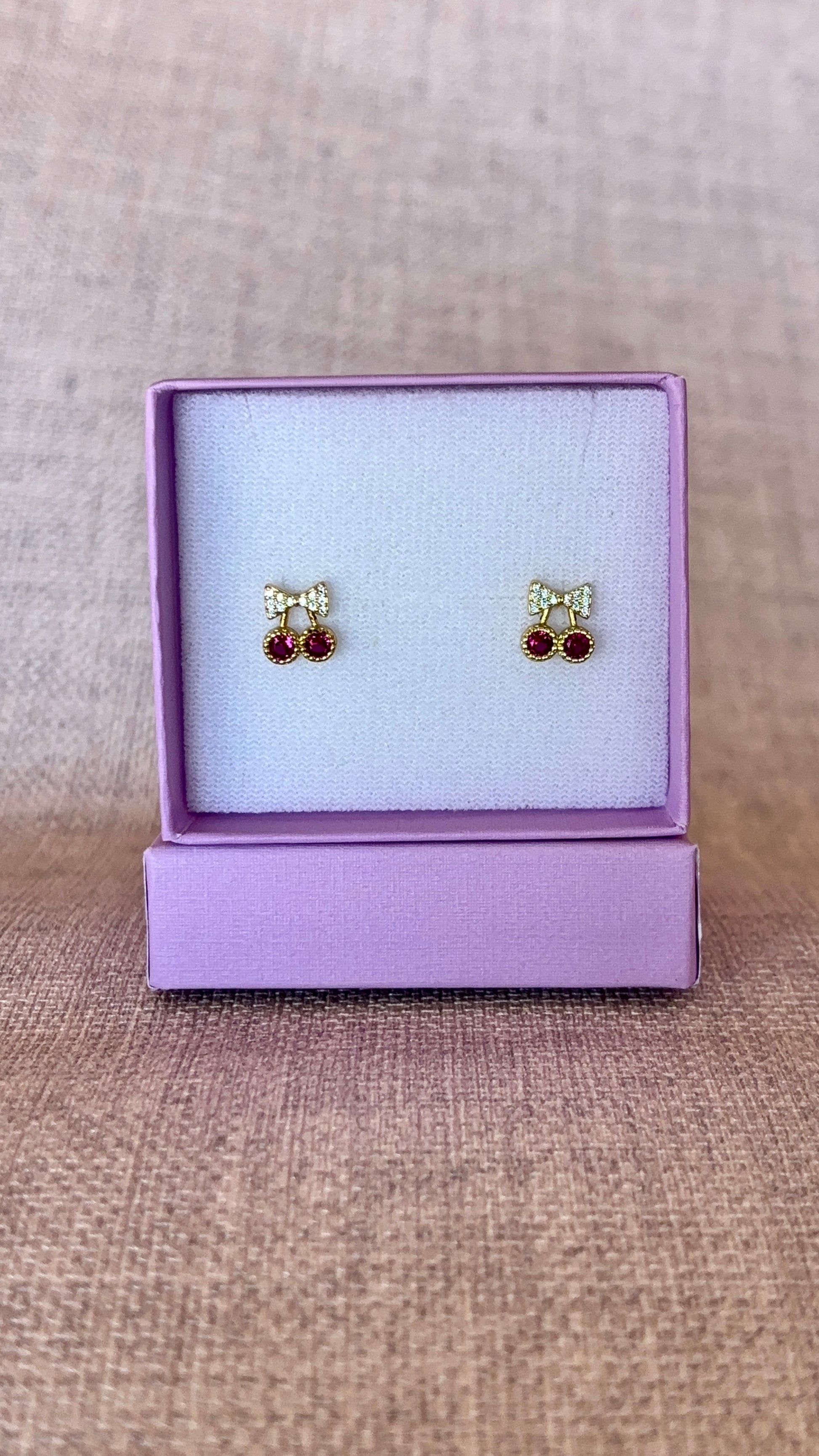 Aretes de cereza con piedras, bañados en oro de 20k.