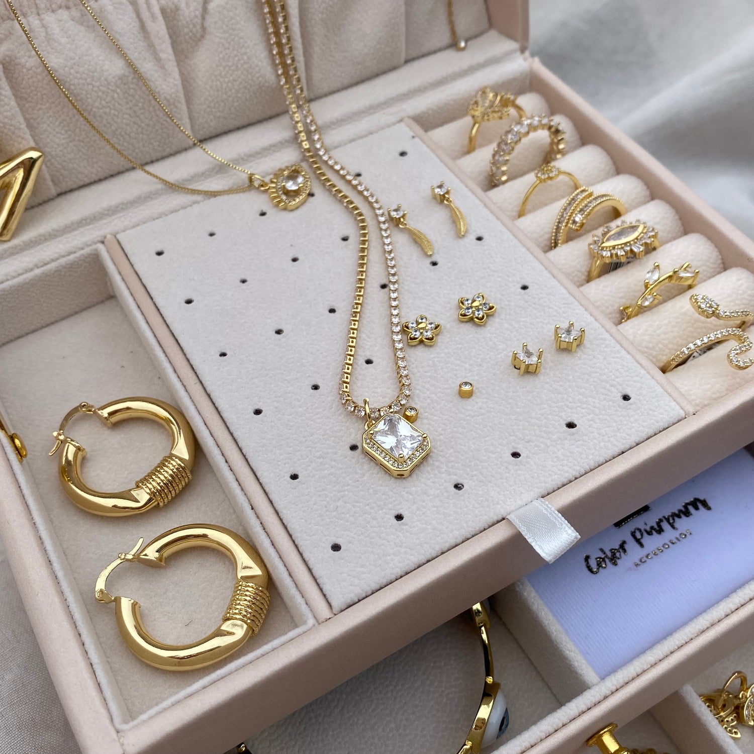 En Color Púrpura ofrecemos una amplia gama de accesorios y materiales, que incluyen joyería bañada en oro, acero inoxidable, oro, entre otros. Es fundamental para nosotros que conozcas los cuidados apropiados para tu joyería, ya que esto garantizará su durabilidad a lo largo del tiempo.